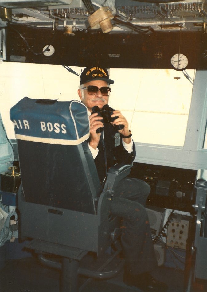 Mort in the Air Boss's seat on the Aircraft Carrier USS John F. Kennedy.