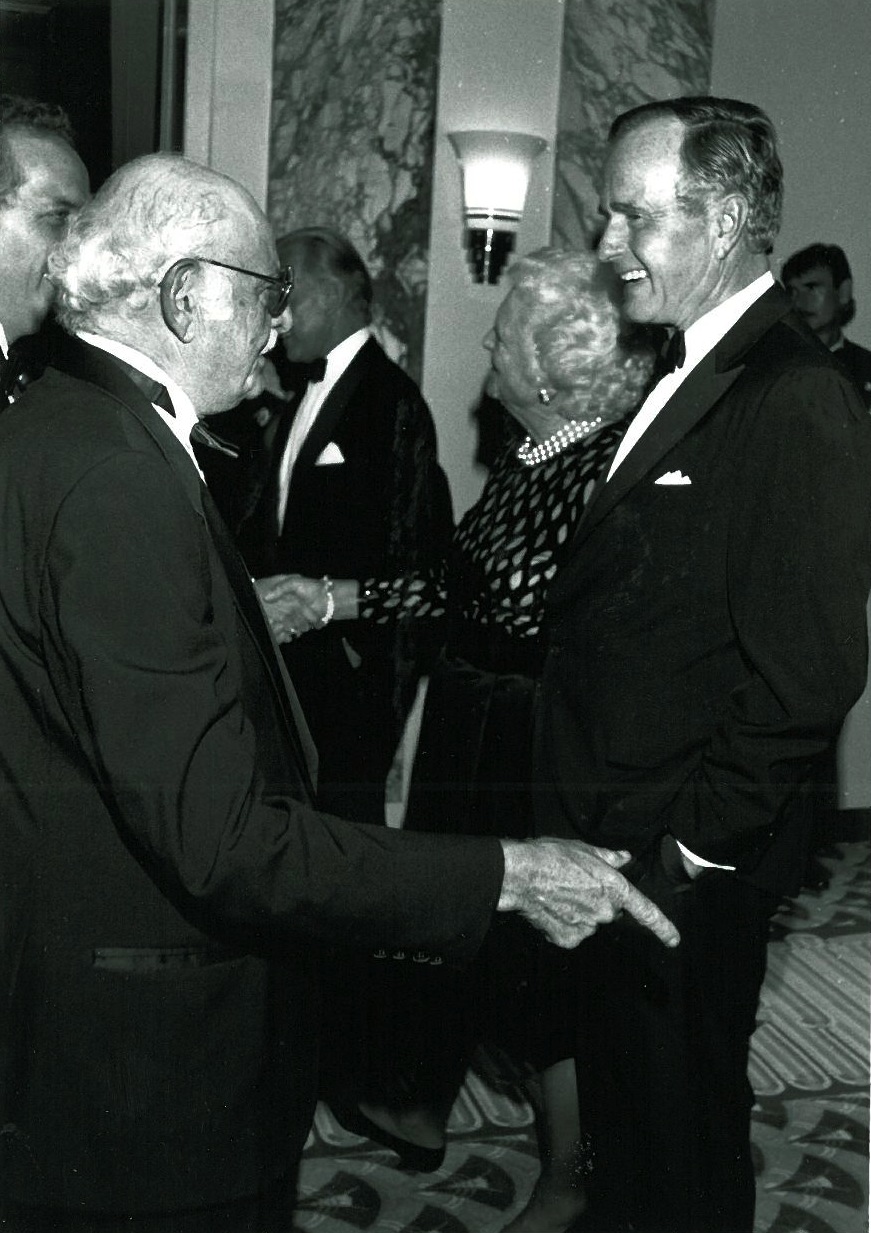 President George Bush and Dr. Feinberg shaking hands with First Lady Barbara Bush in the background.