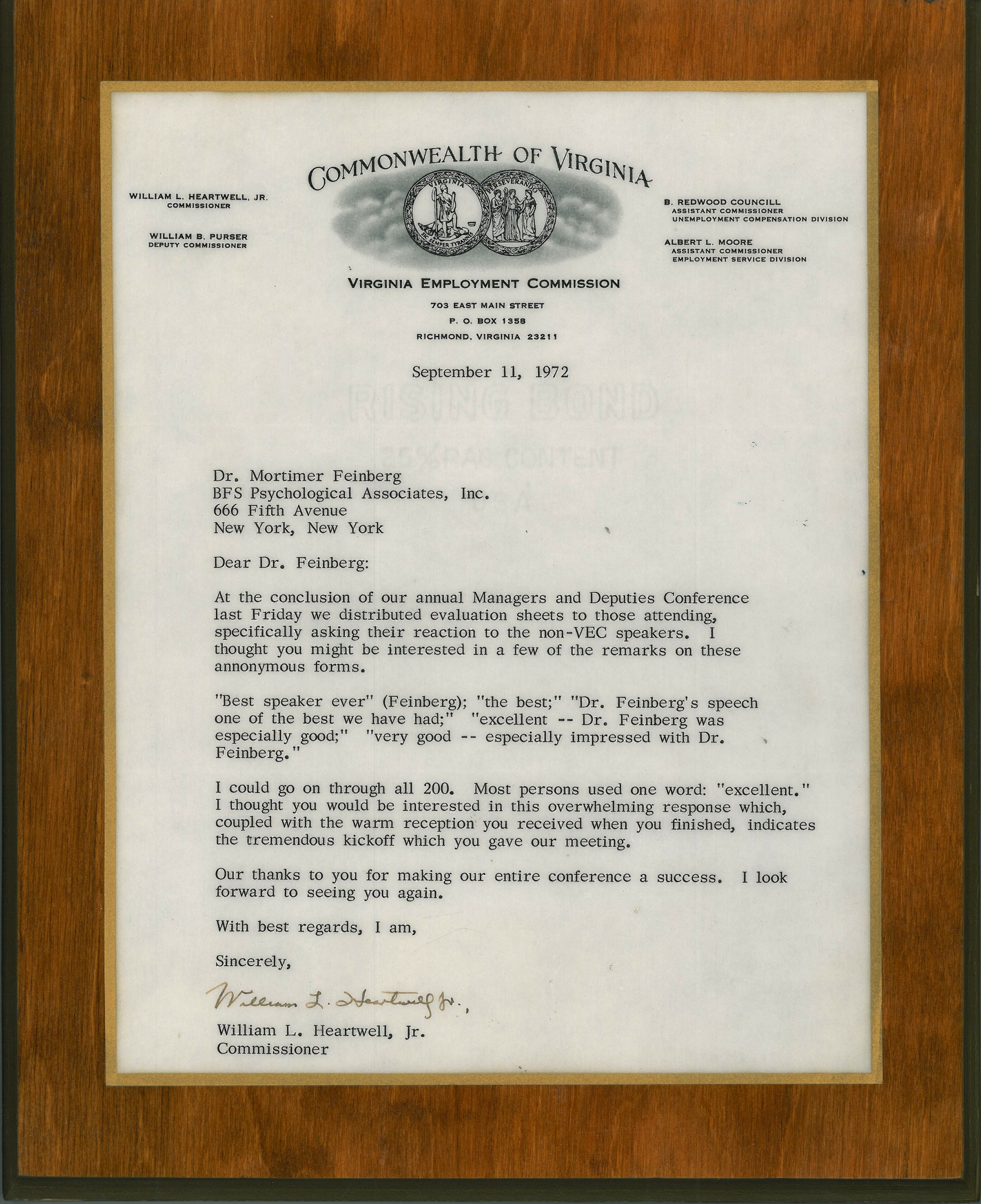 Recognition and letter from the Commonwealth of Virginia for the excellent presentation at their Annual Meeting for Managers, 1972.
